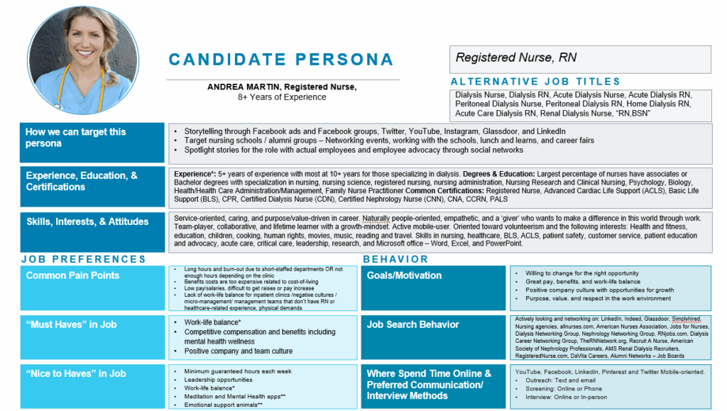 Analyze past hires, interview top performers, and gather input from hiring managers. Identify motivations, goals, concerns, and communication preferences. Document personas to guide content and sourcing strategies. See this HubSpot guide for a helpful framework. Linkedin’s HR Glossary has more.